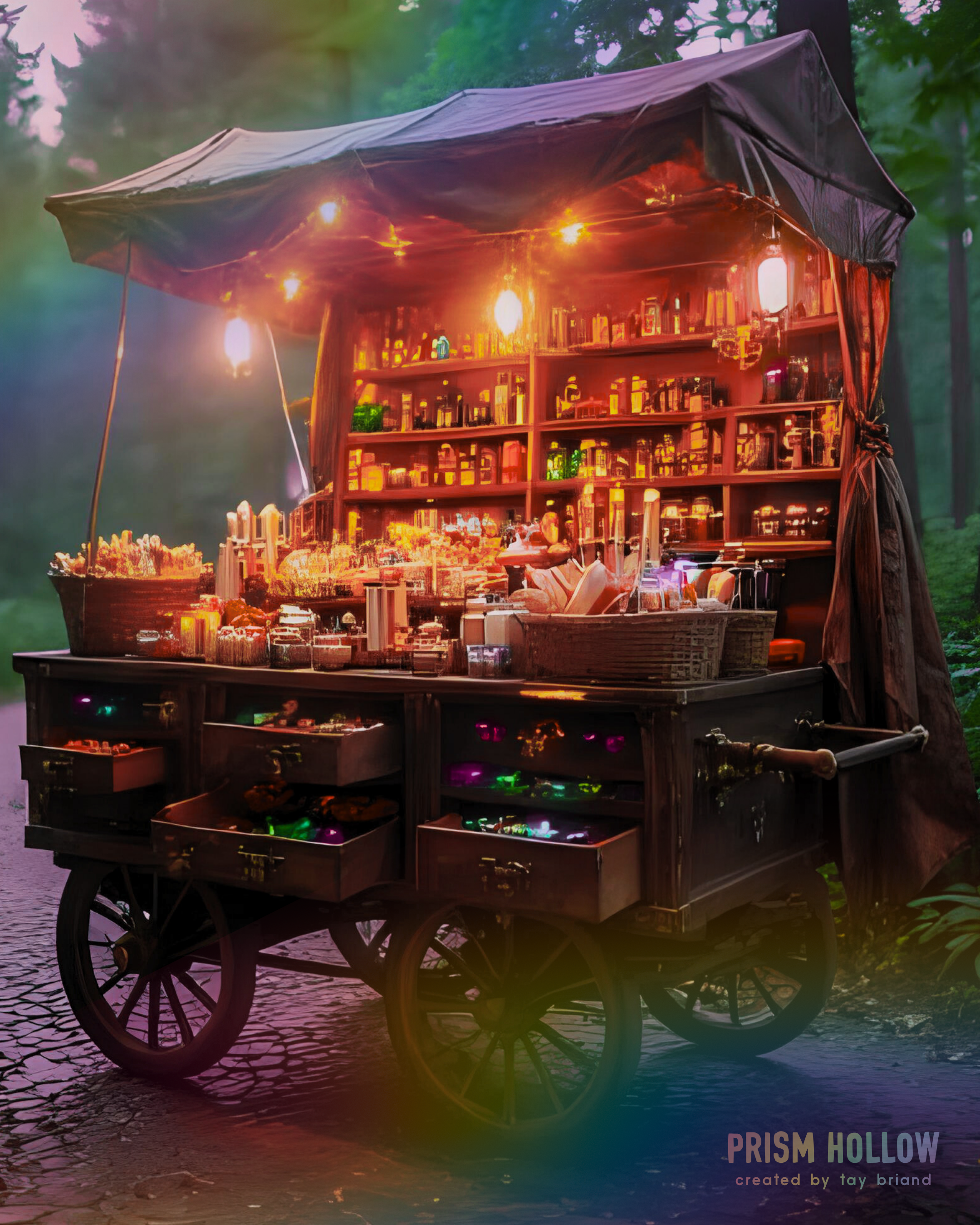 Somewhere along your path through the Realm, a street cart rolls out of the mist. Lanterns glowing. Shelves humming with magic.